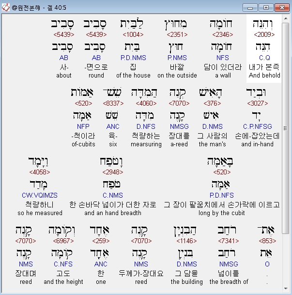 히브리어구약BHS,5 וְהִנֵּה חֹומָה מִחוּץ לַבַּיִת סָבִיב סָבִיב וּבְיַד הָאִישׁ קְנֵה הַמִּדָּה שֵׁשׁ־אַמֹּות בָּאַמָּה וָטֹפַח וַיָּמָד אֶת־רֹחַב הַבִּנְיָן קָנֶה אֶחָד וְקֹומָה קָנֶה אֶחָד׃