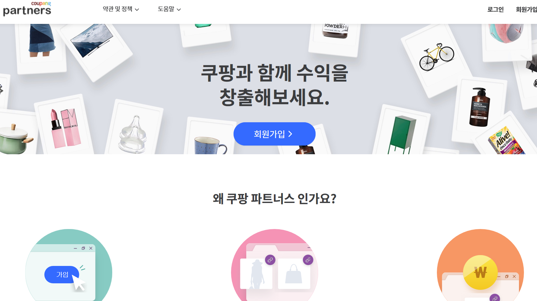 쿠팡은 매우 전투적으로 인터넷 쇼핑몰 시장을 점령하기 위해 노력하는 것 같습니다. 그에 따라 다양한 시도들을 하고 있는 것 같은데요~ 그 중에 하나가 바로 쿠팡 파트너스라고 할 수 있습니다.