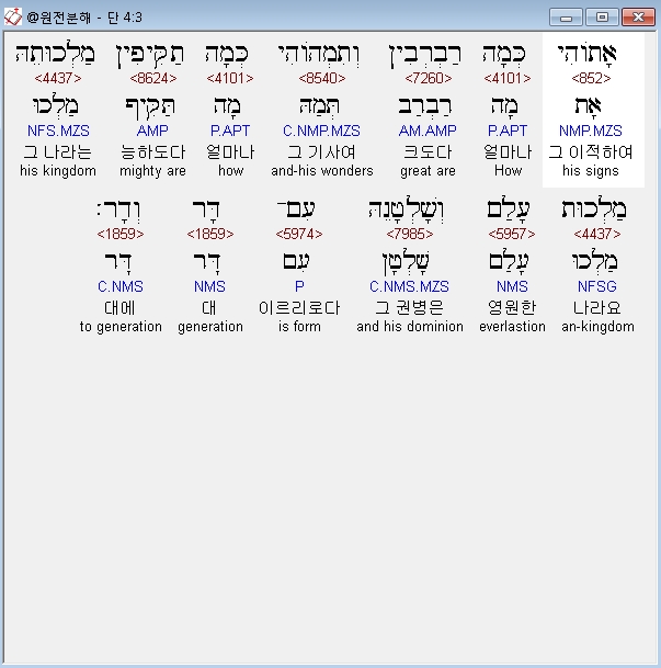 히브리어구약BHS,3 אָתֹוהִי כְּמָה רַבְרְבִין וְתִמְהֹוהִי כְּמָה תַקִּיפִין מַלְכוּתֵהּ מַלְכוּת עָלַם וְשָׁלְטָנֵהּ עִם־דָּר וְדָר׃