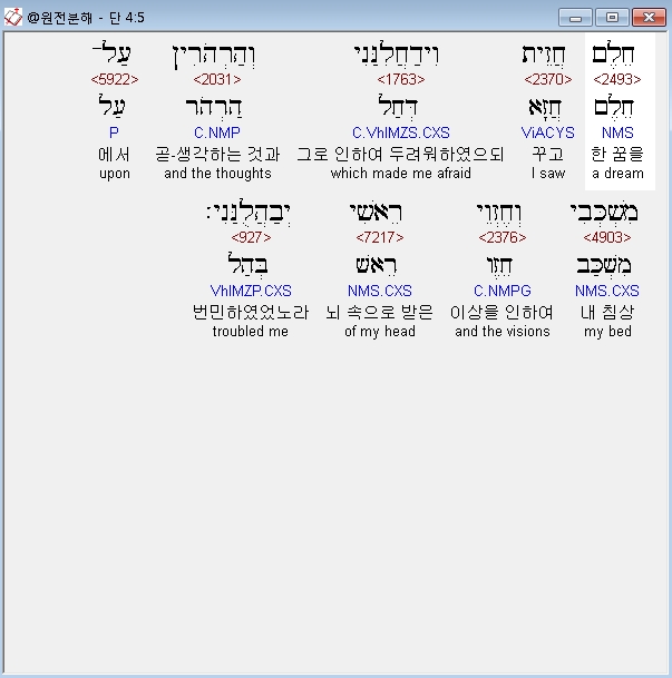 히브리어구약BHS,5 חֵלֶם חֲזֵית וִידַחֲלִנַּנִי וְהַרְהֹרִין עַל־מִשְׁכְּבִי וְחֶזְוֵי רֵאשִׁי יְבַהֲלֻנַּנִי׃