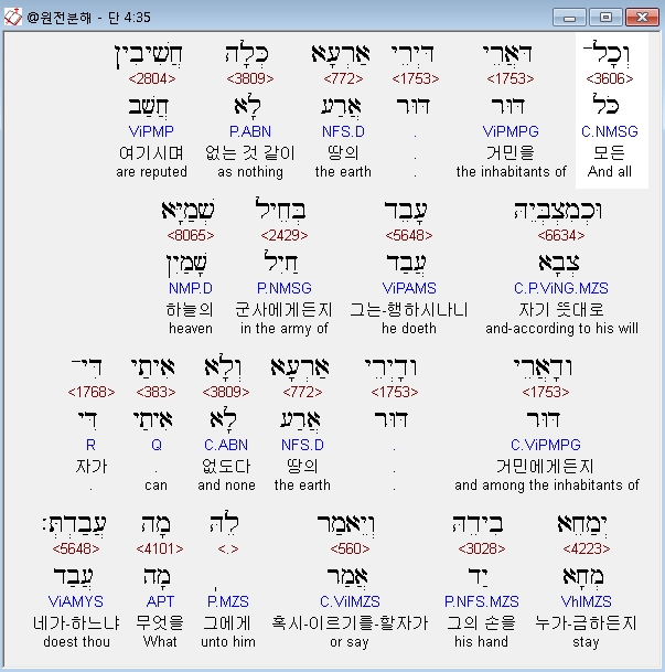 영어NRSV,35 All the inhabitants of the earth are accounted as nothing, and he does what he wills with the host of heaven and the inhabitants of the earth. There is no one who can stay his hand or say to him, "What are you doing?"
