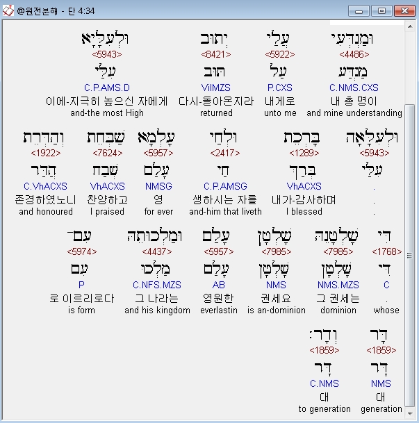 영어NASB,34 "But at the end of that period I, Nebuchadnezzar, raised my eyes toward heaven, and my reason returned to me, and I blessed the Most High and praised and honored Him who lives forever; For His dominion is an everlasting dominion, And His kingdom endures from generation to generation.