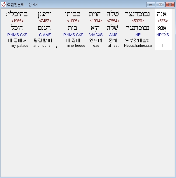 히브리어구약BHS,4 אֲנָה נְבוּכַדְנֶצַּר שְׁלֵה הֲוֵית בְּבֵיתִי וְרַעְןַן בְּהֵיכְלִי׃
