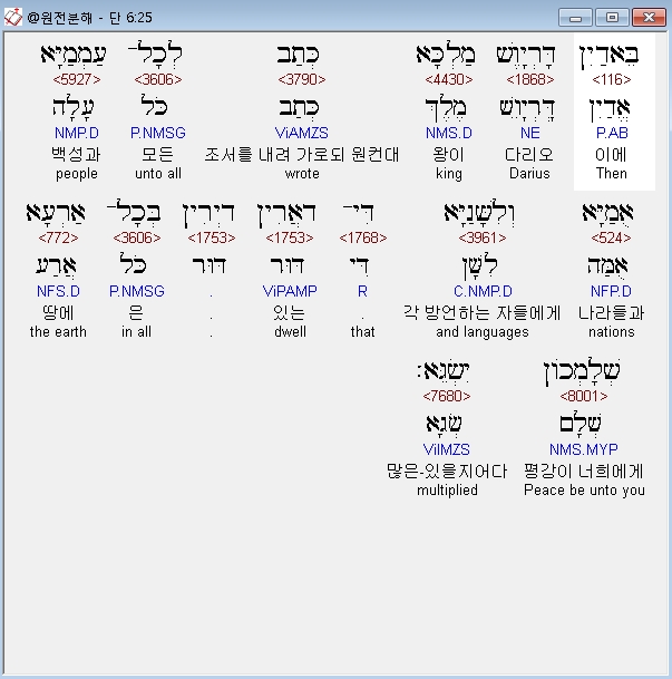 히브리어구약BHS,25 בֵּאדַיִן דָּרְיָוֶשׁ מַלְכָּא כְּתַב לְכָל־עַמְמַיָּא אֻמַיָּא וְלִשָּׁנַיָּא דִּי־[כ= דָאֲרִין] [ק= דָיְרִין] בְּכָל־אַרְעָא שְׁלָמְכֹון יִשְׂגֵּא׃