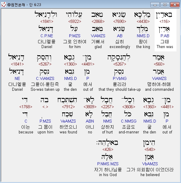 히브리어구약BHS,23 בֵּאדַיִן מַלְכָּא שַׂגִּיא* טְאֵב עֲלֹוהִי וּלְדָנִיֵּאל אֲמַר לְהַנְסָקָה מִן־גֻּבָּא וְהֻסַּק דָּנִיֵּאל מִן־גֻּבָּא וְכָל־חֲבָל לָא־הִשְׁתְּכַח בֵּהּ דִּי הֵימִן בֵּאלָהֵהּ׃