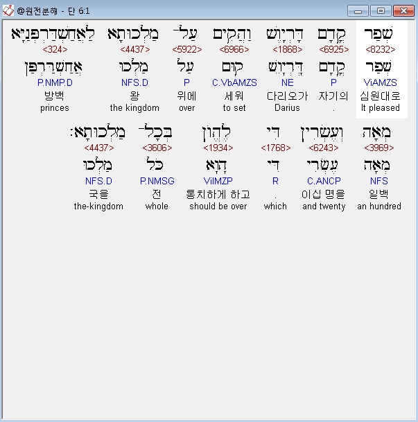 히브리어구약BHS,1 שְׁפַר קֳדָם דָּרְיָוֶשׁ וַהֲקִים עַל־מַלְכוּתָא לַאֲחַשְׁדַּרְפְּנַיָּא מְאָה וְעֶשְׂרִין דִּי לֶהֱוֹן בְּכָל־מַלְכוּתָא׃