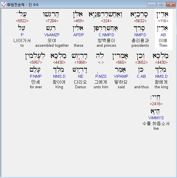 히브리어구약BHS,6 אֱדַיִן סָרְכַיָּא וַאֲחַשְׁדַּרְפְּנַיָּא אִלֵּן הַרְגִּשׁוּ עַל־מַלְכָּא וְכֵן אָמְרִין לֵהּ דָּרְיָוֶשׁ מַלְכָּא לְעָלְמִין חֱיִי׃