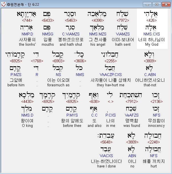 헬라어구약Septuagint,23 και σεσωκε με ο θεος απο των λεοντων καθοτι δικαιοσυνη εν εμοι ευρεθη εναντιον αυτου και εναντιον δε σου βασιλευ ουτε αγνοια ουτε αμαρτια ευρεθη εν εμοι συ δε ηκουσας ανθρωπων πλανωντων βασιλεις και ερριψας με εις τον λακκον των λεοντων εις απωλειαν