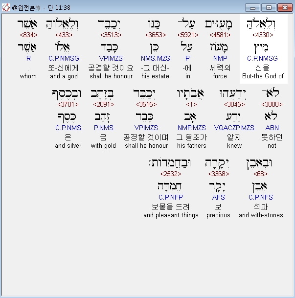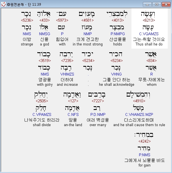 헬라어구약Septuagint,39 ποιησει πολεων και εις οχυρωμα ισχυρον ηξει μετα θεου αλλοτριου ου εαν επιγνω πληθυνει δοξαν και κατακυριευσει αυτου επι πολυ και χωραν απομεριει εις δωρεαν