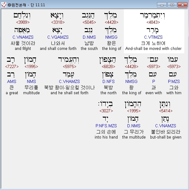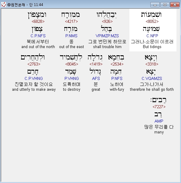 히브리어구약BHS,44 וּשְׁמֻעֹות יְבַהֲלֻהוּ מִמִּזְרָח וּמִצָּפֹון וְיָצָא בְּחֵמָא גְדֹלָה לְהַשְׁמִיד וּלְהַחֲרִים רַבִּים׃