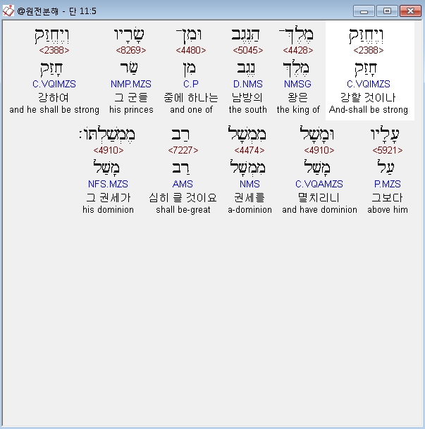 영어NRSV,5 "Then the king of the south shall grow strong, but one of his officers shall grow stronger than he and shall rule a realm greater than his own realm.