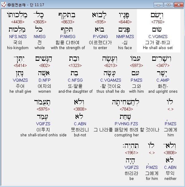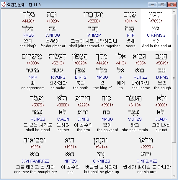 히브리어구약BHS,6 וּלְקֵץ שָׁנִים יִתְחַבָּרוּ וּבַת מֶלֶךְ־הַנֶּגֶב תָּבֹוא אֶל־מֶלֶךְ הַצָּפֹון לַעֲשֹׂות מֵישָׁרִים וְלֹא־תַעְצֹר כֹּוחַ הַזְּרֹועַ וְלֹא יַעֲמֹד וּזְרֹעֹו וְתִנָּתֵן הִיא וּמְבִיאֶיהָ וְהַיֹּלְדָהּ וּמַחֲזִקָהּ בָּעִתִּים׃