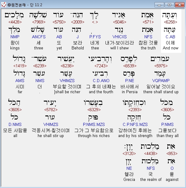 히브리어구약BHS,2 וְעַתָּה אֱמֶת אַגִּיד לָךְ הִנֵּה־עֹוד שְׁלֹשָׁה מְלָכִים עֹמְדִים לְפָרַס וְהָרְבִיעִי יַעֲשִׁיר עֹשֶׁר־גָּדֹול מִכֹּל וּכְחֶזְקָתֹו בְעָשְׁרֹו יָעִיר הַכֹּל אֵת מַלְכוּת יָוָן׃