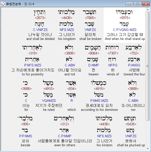 히브리어구약BHS,4 וּכְעָמְדֹו תִּשָּׁבֵר מַלְכוּתֹו וְתֵחָץ לְאַרְבַּע רוּחֹות הַשָּׁמָיִם וְלֹא לְאַחֲרִיתֹו וְלֹא כְמָשְׁלֹו אֲשֶׁר מָשָׁל כִּי תִנָּתֵשׁ מַלְכוּתֹו וְלַאֲחֵרִים מִלְּבַד־אֵלֶּה׃