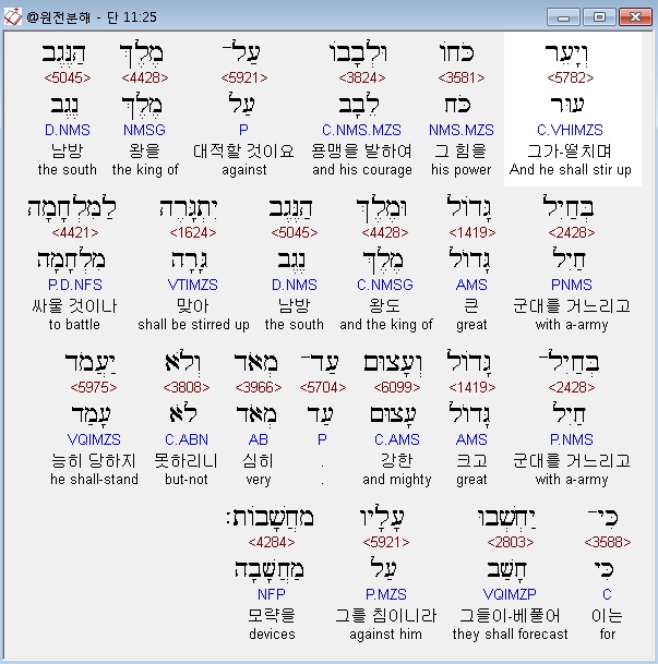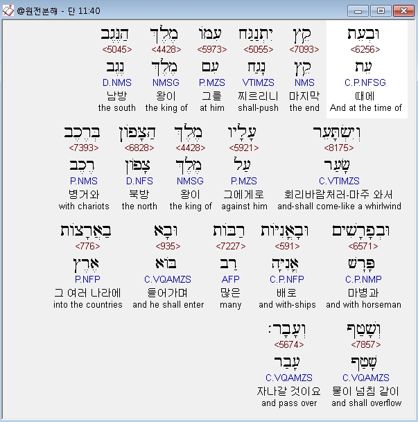 히브리어구약BHS,40 וּבְעֵת קֵץ יִתְנַגַּח עִמֹּו מֶלֶךְ הַנֶּגֶב וְיִשְׂתָּעֵר עָלָיו מֶלֶךְ הַצָּפֹון בְּרֶכֶב וּבְפָרָשִׁים וּבָאֳנִיֹּות רַבֹּות וּבָא בַאֲרָצֹות וְשָׁטַף וְעָבָר׃