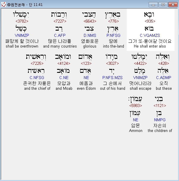 히브리어구약BHS,41 וּבָא בְּאֶרֶץ הַצְּבִי וְרַבֹּות יִכָּשֵׁלוּ וְאֵלֶּה יִמָּלְטוּ מִיָּדֹו אֱדֹום וּמֹואָב וְרֵאשִׁית בְּנֵי עַמֹּון׃