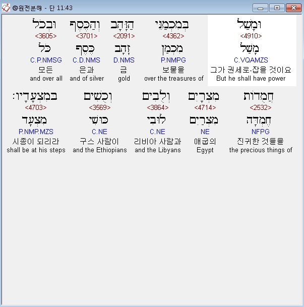 영어NRSV,43 He shall become ruler of the treasures of gold and of silver, and all the riches of Egypt; and the Libyans and the Ethiopians shall follow in his train.