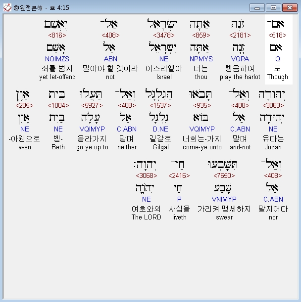히브리어구약BHS,15 אִם־זֹנֶה אַתָּה יִשְׂרָאֵל אַל־יֶאְשַׁם יְהוּדָה וְאַל־תָּבֹאוּ הַגִּלְגָּל וְאַל־תַּעֲלוּ בֵּית אָוֶן וְאַל־תִּשָּׁבְעוּ חַי־יְהוָה׃