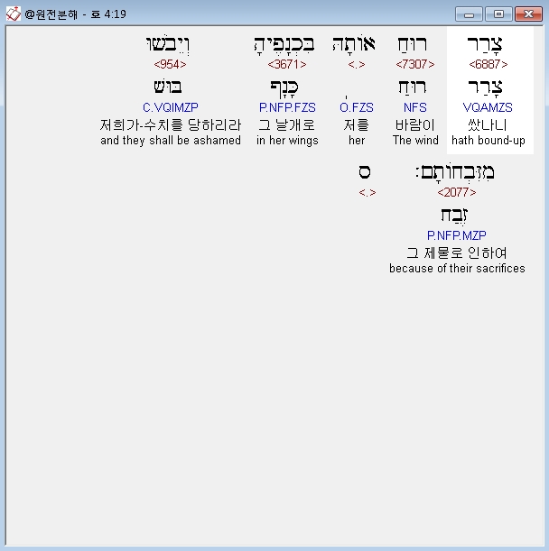 히브리어구약BHS,19 צָרַר רוּחַ אֹותָהּ בִּכְנָפֶיהָ וְיֵבֹשׁוּ מִזִּבְחֹותָם׃ ס