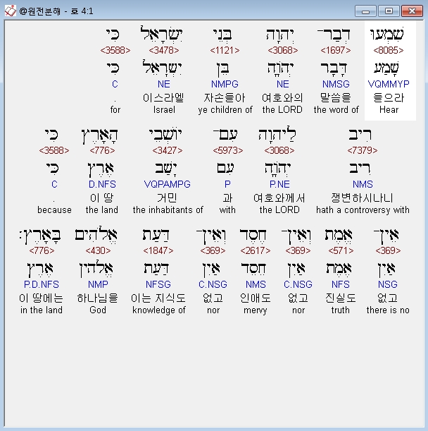 히브리어구약BHS,1 שִׁמְעוּ דְבַר־יְהוָה בְּנֵי יִשְׂרָאֵל כִּי רִיב לַיהוָה עִם־יֹושְׁבֵי הָאָרֶץ כִּי אֵין־אֱמֶת וְאֵין־חֶסֶד וְאֵין־דַּעַת אֱלֹהִים בָּאָרֶץ׃