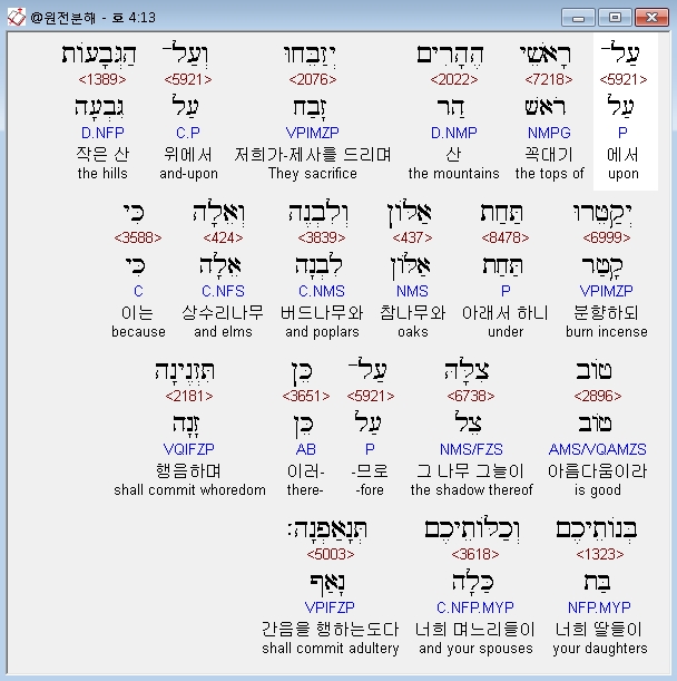| 히브리어 호세아 5장 전체 원어 원문 성경 공부 주석 강해 설교 해설 해석 (0) | 2020.10.26 |