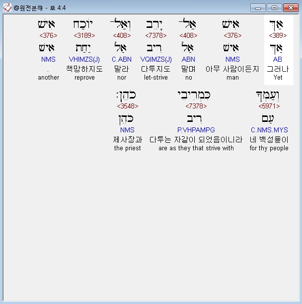 히브리어구약BHS,4 אַךְ אִישׁ אַל־יָרֵב וְאַל־יֹוכַח אִישׁ וְעַמְּךָ כִּמְרִיבֵי כֹהֵן׃