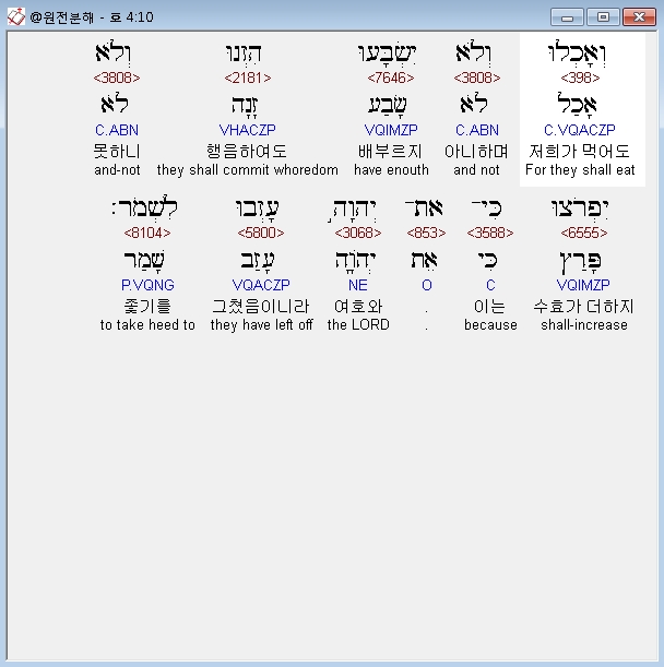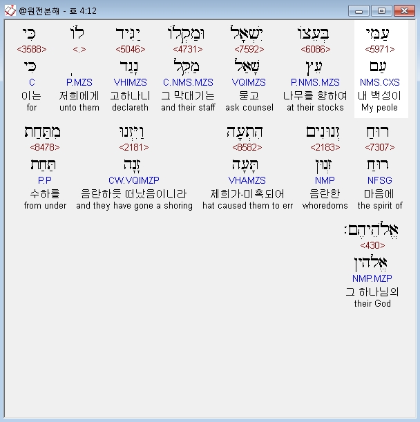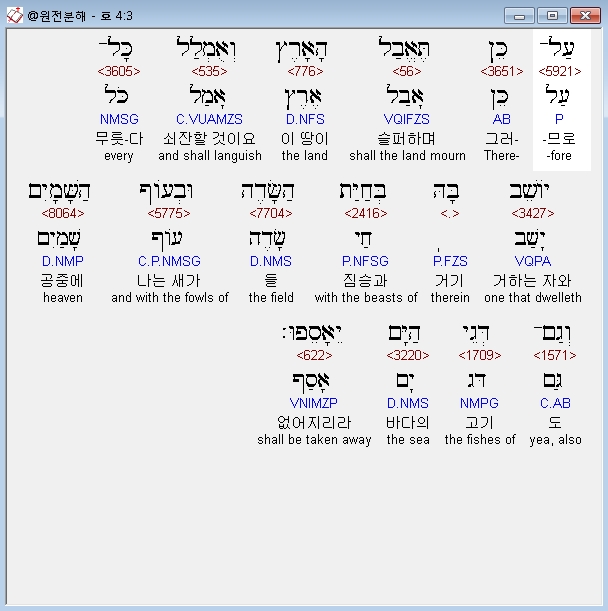 | 히브리어 호세아 3장 전체 원어 원문 성경 공부 주석 강해 설교 해설 해석 (0) | 2020.10.26 |