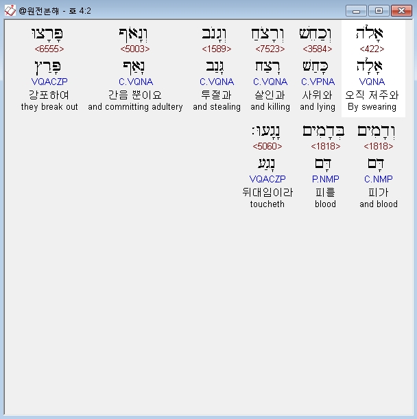 히브리어구약BHS,2 אָלֹה וְכַחֵשׁ וְרָצֹחַ וְגָנֹב וְנָאֹף פָּרָצוּ וְדָמִים בְּדָמִים נָגָעוּ׃
