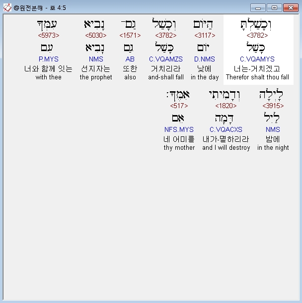 히브리어구약BHS,5 וְכָשַׁלְתָּ הַיֹּום וְכָשַׁל גַּם־נָבִיא עִמְּךָ לָיְלָה וְדָמִיתִי אִמֶּךָ׃