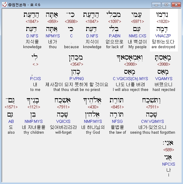 히브리어구약BHS,6 נִדְמוּ עַמִּי מִבְּלִי הַדָּעַת כִּי־אַתָּה הַדַּעַת מָאַסְתָּ וְאֶמְאָסְאךָ מִכַּהֵן לִי וַתִּשְׁכַּח תֹּורַת אֱלֹהֶיךָ אֶשְׁכַּח בָּנֶיךָ גַּם־אָנִי׃