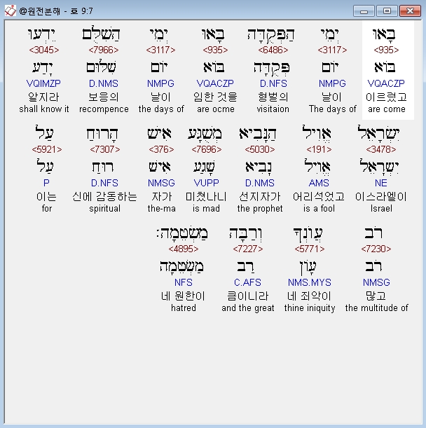 히브리어구약BHS,7 בָּאוּ יְמֵי הַפְּקֻדָּה בָּאוּ יְמֵי הַשִּׁלֻּם יֵדְעוּ יִשְׂרָאֵל אֱוִיל הַנָּבִיא מְשֻׁגָּע אִישׁ הָרוּחַ עַל רֹב עֲוֹנְךָ וְרַבָּה מַשְׂטֵמָה׃