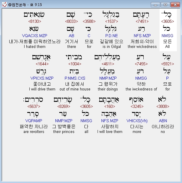 헬라어구약Septuagint,15 πασαι αι κακιαι αυτων εις γαλγαλ οτι εκει αυτους εμισησα δια τας κακιας των επιτηδευματων αυτων εκ του οικου μου εκβαλω αυτους ου μη προσθησω του αγαπησαι αυτους παντες οι αρχοντες αυτων απειθουντες