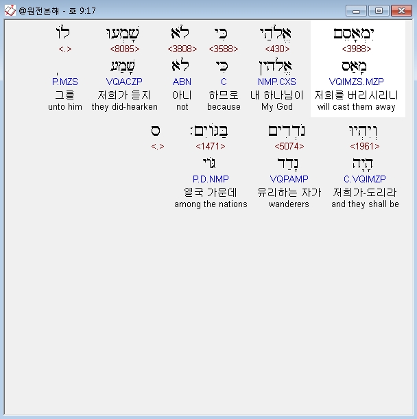 히브리어구약BHS,17 יִמְאָסֵם אֱלֹהַי כִּי לֹא שָׁמְעוּ לֹו וְיִהְיוּ נֹדְדִים בַּגֹּויִם׃ ס
