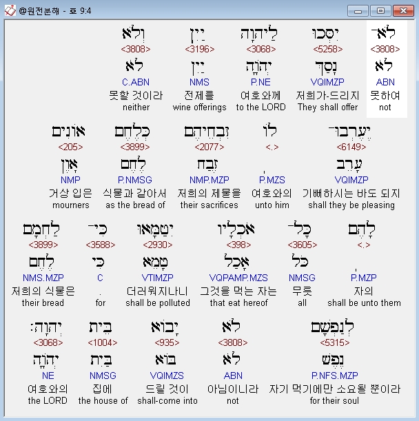 영어NASB,4 They will not pour out libations of wine to the LORD, Their sacrifices will not please Him. Their bread will be like mourners' bread; All who eat of it will be defiled, For their bread will be for themselves alone; It will not enter the house of the LORD.
