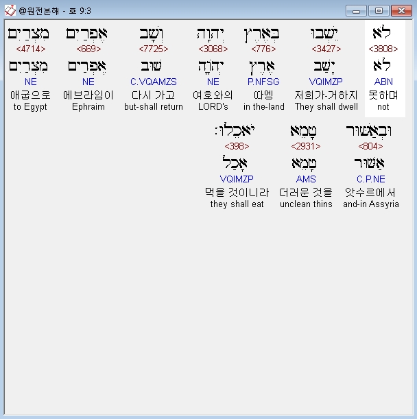 히브리어구약BHS,3 לֹא יֵשְׁבוּ בְּאֶרֶץ יְהוָה וְשָׁב אֶפְרַיִם מִצְרַיִם וּבְאַשּׁוּר טָמֵא יֹאכֵלוּ׃