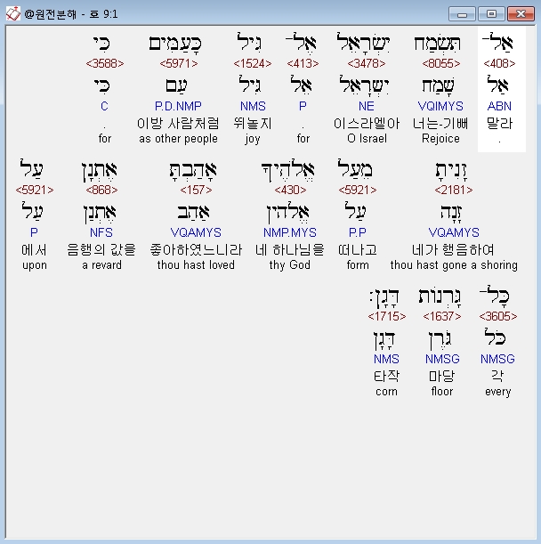히브리어구약BHS,1 אַל־תִּשְׂמַח יִשְׂרָאֵל אֶל־גִּיל כָּעַמִּים כִּי זָנִיתָ מֵעַל אֱלֹהֶיךָ אָהַבְתָּ אֶתְןָן עַל כָּל־גָּרְנֹות דָּגָן׃