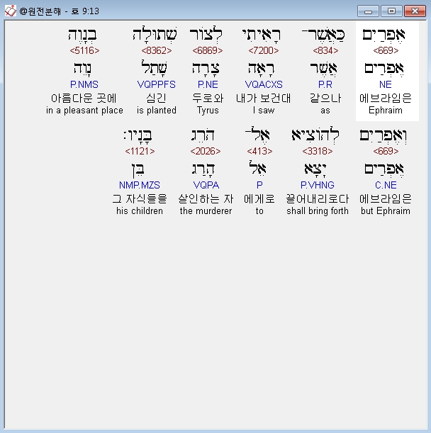 히브리어구약BHS,13 אֶפְרַיִם כַּאֲשֶׁר־רָאִיתִי לְצֹור שְׁתוּלָה בְנָוֶה וְאֶפְרַיִם לְהֹוצִיא אֶל־הֹרֵג בָּנָיו׃