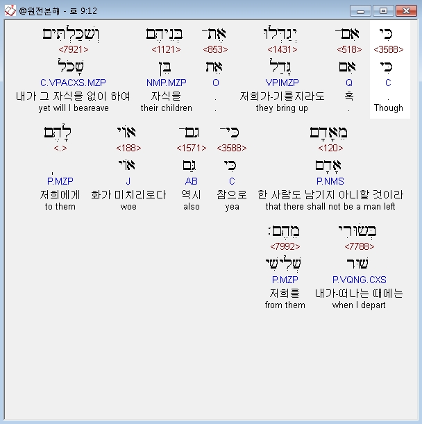 히브리어구약BHS,12 כִּי אִם־יְגַדְּלוּ אֶת־בְּנֵיהֶם וְשִׁכַּלְתִּים מֵאָדָם כִּי־גַם־אֹוי לָהֶם בְּשׂוּרִי מֵהֶם׃