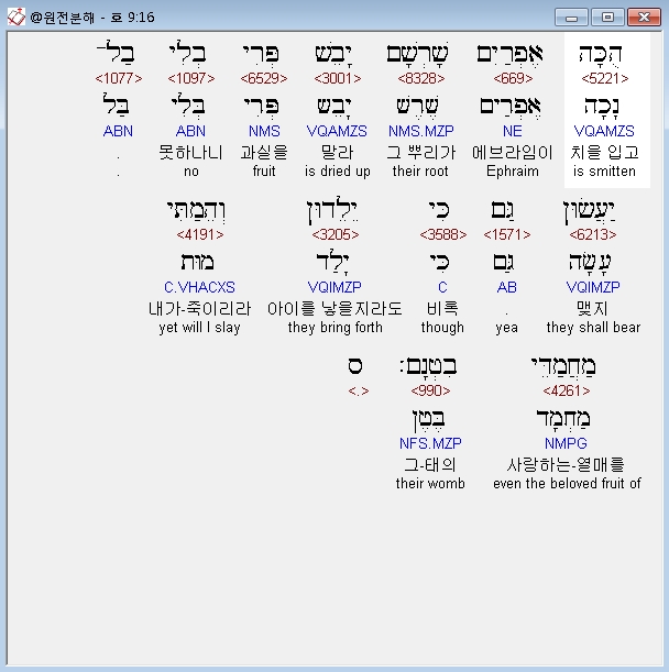 개역개정,16 에브라임은 매를 맞아 그 뿌리가 말라 열매를 맺지 못하나니 비록 아이를 낳을지라도 내가 그 사랑하는 태의 열매를 죽이리라