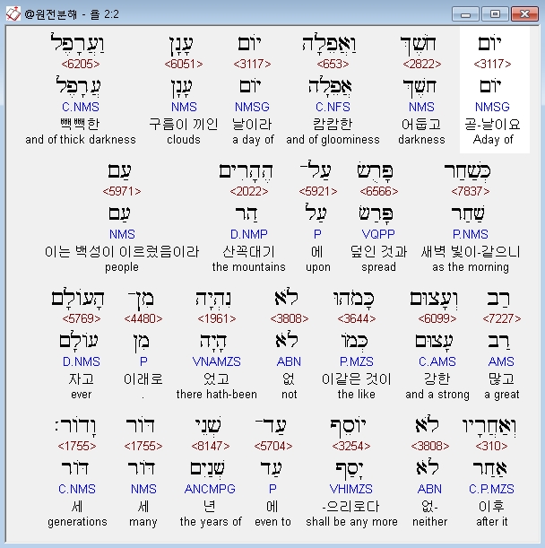 히브리어구약BHS,2 יֹום חֹשֶׁךְ וַאֲפֵלָה יֹום עָןָן וַעֲרָפֶל כְּשַׁחַר פָּרֻשׂ עַל־הֶהָרִים עַם רַב וְעָצוּם כָּמֹהוּ לֹא נִהְיָה מִן־הָעֹולָם וְאַחֲרָיו לֹא יֹוסֵף עַד־שְׁנֵי דֹּור וָדֹור׃