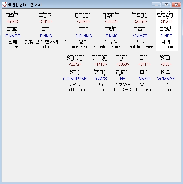 히브리어구약BHS,31 הַשֶּׁמֶשׁ יֵהָפֵךְ לְחֹשֶׁךְ וְהַיָּרֵחַ לְדָם לִפְנֵי בֹּוא יֹום יְהוָה הַגָּדֹול וְהַנֹּורָא׃