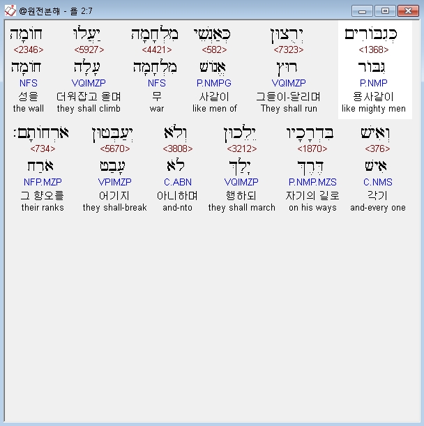 히브리어구약BHS,7 כְּגִבֹּורִים יְרֻצוּן כְּאַנְשֵׁי מִלְחָמָה יַעֲלוּ חֹומָה וְאִישׁ בִּדְרָכָיו יֵלֵכוּן וְלֹא יְעַבְּטוּן אֹרְחֹותָם׃