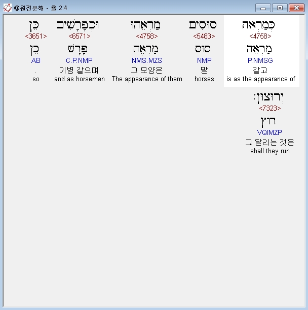 히브리어구약BHS,4 כְּמַרְאֵה סוּסִים מַרְאֵהוּ וּכְפָרָשִׁים כֵּן יְרוּצוּן׃