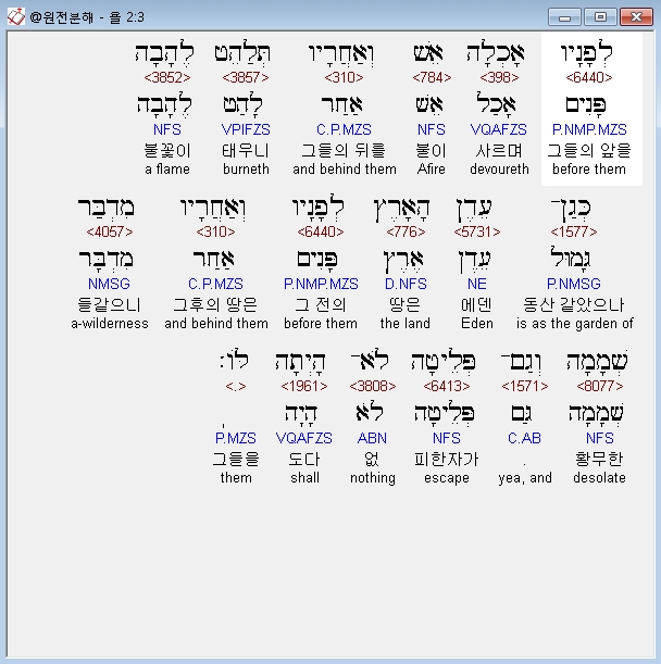 히브리어구약BHS,3 לְפָנָיו אָכְלָה אֵשׁ וְאַחֲרָיו תְּלַהֵט לֶהָבָה כְּגַן־עֵדֶן הָאָרֶץ לְפָנָיו וְאַחֲרָיו מִדְבַּר שְׁמָמָה וְגַם־פְּלֵיטָה לֹא־הָיְתָה לֹּו׃
