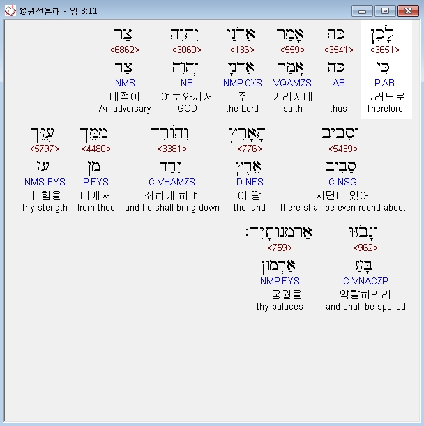 히브리어구약BHS,11 לָכֵן כֹּה אָמַר אֲדֹנָי יְהוִה צַר וּסְבִיב הָאָרֶץ וְהֹורִד מִמֵּךְ עֻזֵּךְ וְנָבֹזּוּ אַרְמְנֹותָיִךְ׃