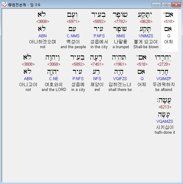 히브리어구약BHS,6 אִם־יִתָּקַע שֹׁופָר בְּעִיר וְעָם לֹא יֶחֱרָדוּ אִם־תִּהְיֶה רָעָה בְּעִיר וַיהוָה לֹא עָשָׂה׃
