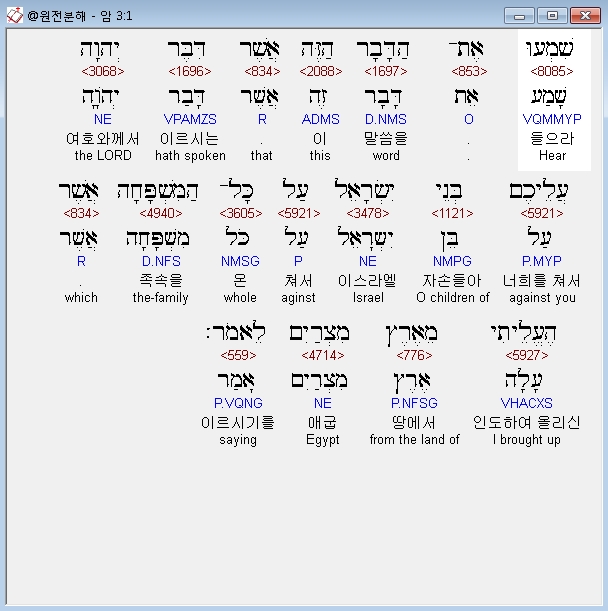 히브리어구약BHS,1 שִׁמְעוּ אֶת־הַדָּבָר הַזֶּה אֲשֶׁר דִּבֶּר יְהוָה עֲלֵיכֶם בְּנֵי יִשְׂרָאֵל עַל כָּל־הַמִּשְׁפָּחָה אֲשֶׁר הֶעֱלֵיתִי מֵאֶרֶץ מִצְרַיִם לֵאמֹר׃
