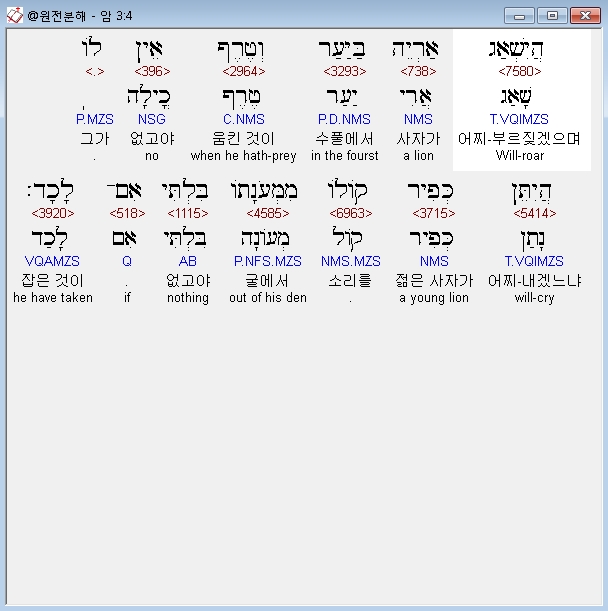 히브리어구약BHS,4 הֲיִשְׁאַג אַרְיֵה בַּיַּעַר וְטֶרֶף אֵין לֹו הֲיִתֵּן כְּפִיר קֹולֹו מִמְּעֹנָתֹו בִּלְתִּי אִם־לָכָד׃