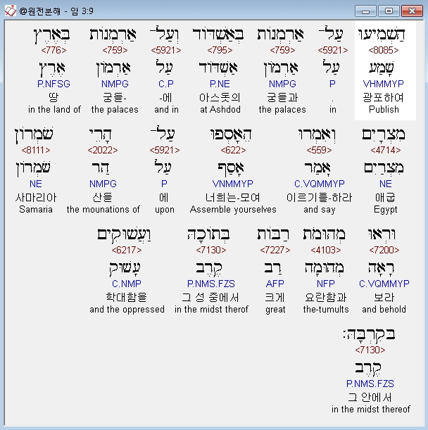 히브리어구약BHS,9 הַשְׁמִיעוּ עַל־אַרְמְנֹות בְּאַשְׁדֹּוד וְעַל־אַרְמְנֹות בְּאֶרֶץ מִצְרָיִם וְאִמְרוּ הֵאָסְפוּ עַל־הָרֵי שֹׁמְרֹון וּרְאוּ מְהוּמֹת רַבֹּות בְּתֹוכָהּ וַעֲשׁוּקִים בְּקִרְבָּהּ׃