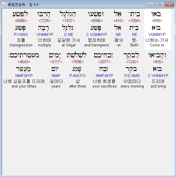 히브리어구약BHS,4 בֹּאוּ בֵית־אֵל וּפִשְׁעוּ הַגִּלְגָּל הַרְבּוּ לִפְשֹׁעַ וְהָבִיאוּ לַבֹּקֶר זִבְחֵיכֶם לִשְׁלֹשֶׁת יָמִים מַעְשְׂרֹתֵיכֶם׃